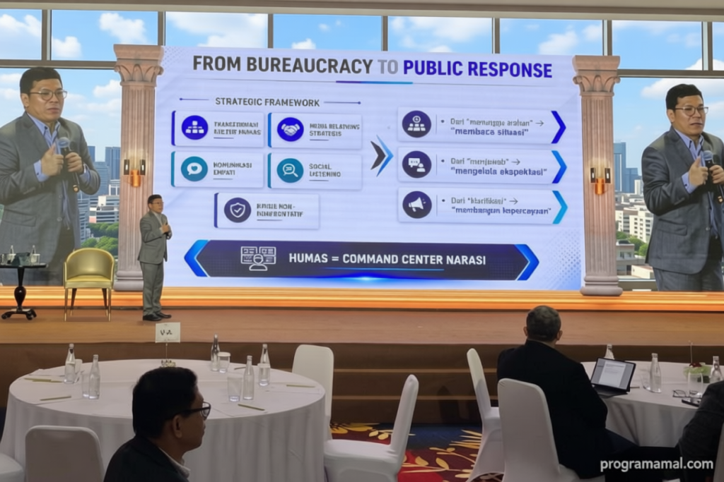 Menurut Benny, transformasi komunikasi di era disrupsi membutuhkan pergeseran dari pendekatan birokratis ke respons publik. “Humas di sini bukan lagi sekadar penyampai informasi, tetapi menjadi pusat komando narasi yang mampu membaca situasi dan mengelola ekspektasi masyarakat,” katanya. Ia menyoroti pentingnya membangun kultur komunikasi yang lebih empatik, mampu memahami dinamika media, serta menerapkan teknik social listening.